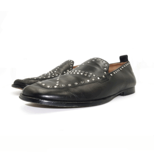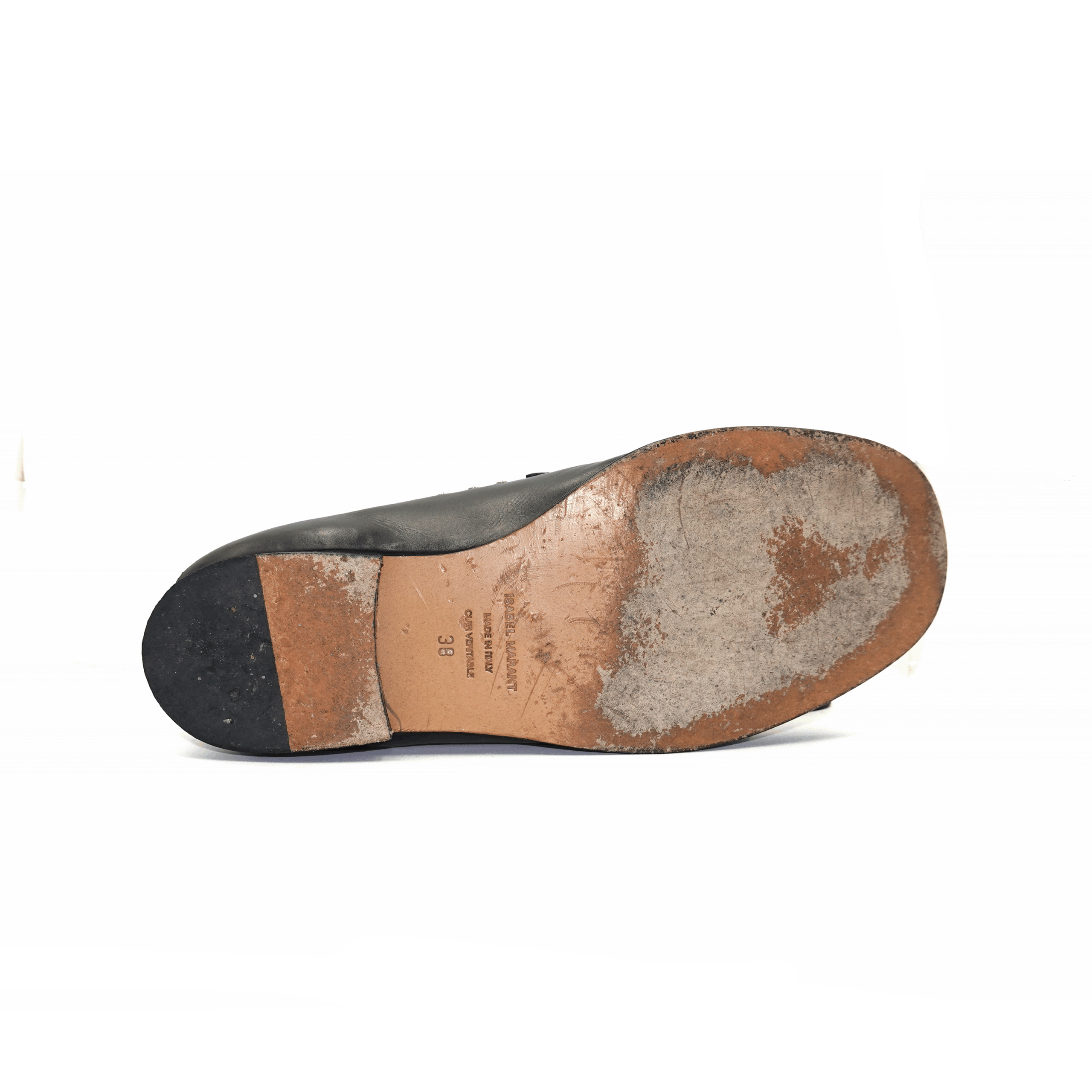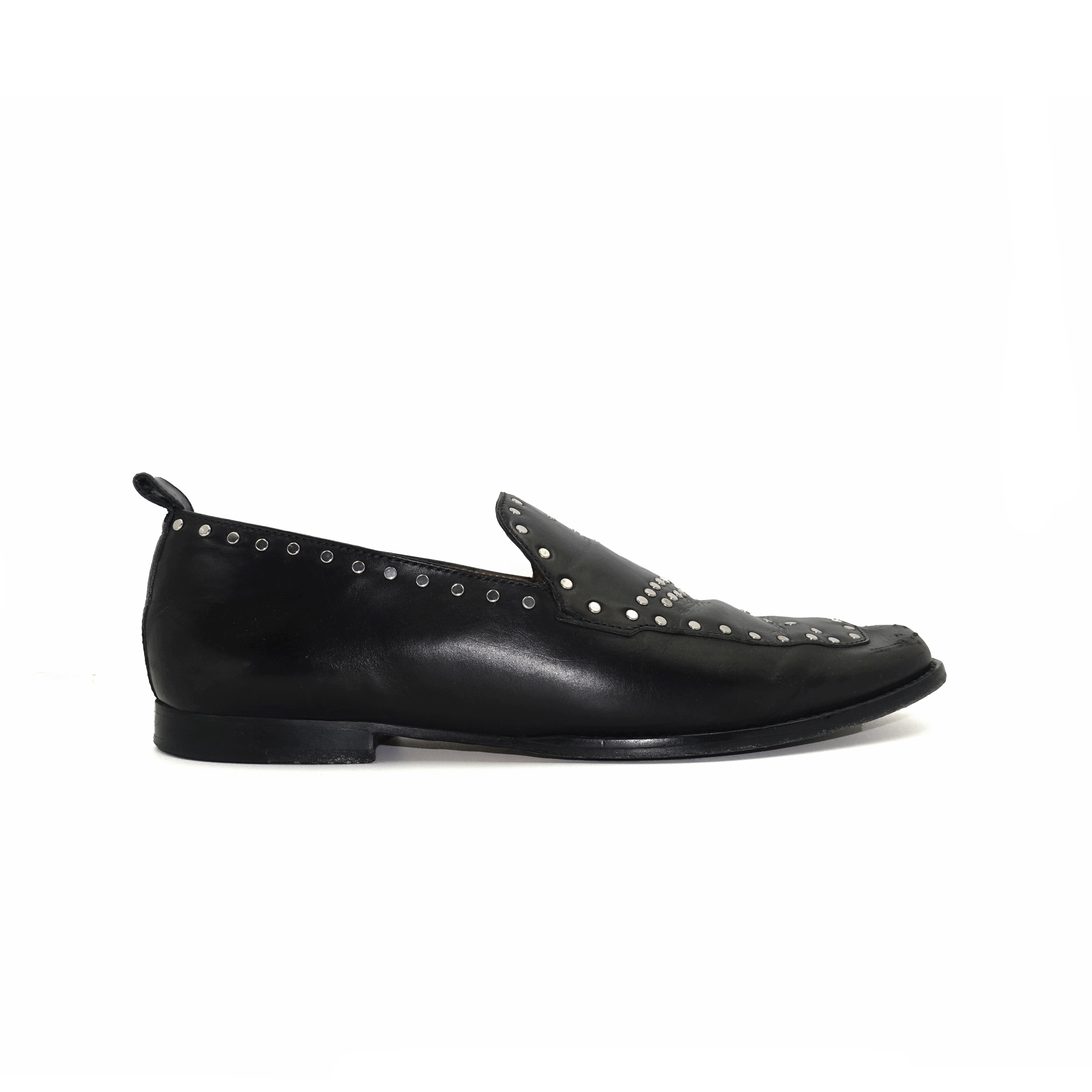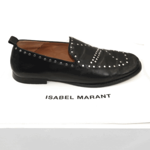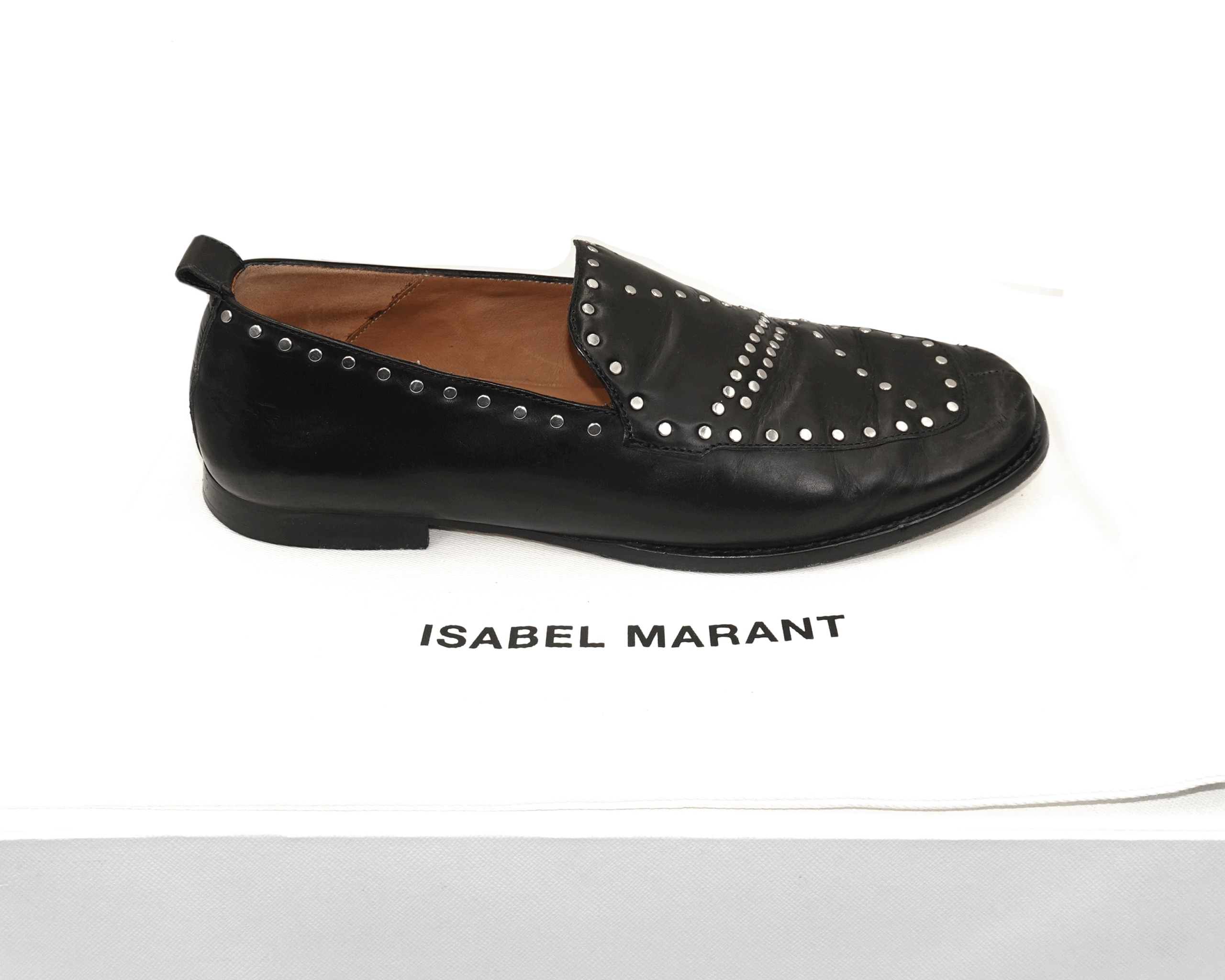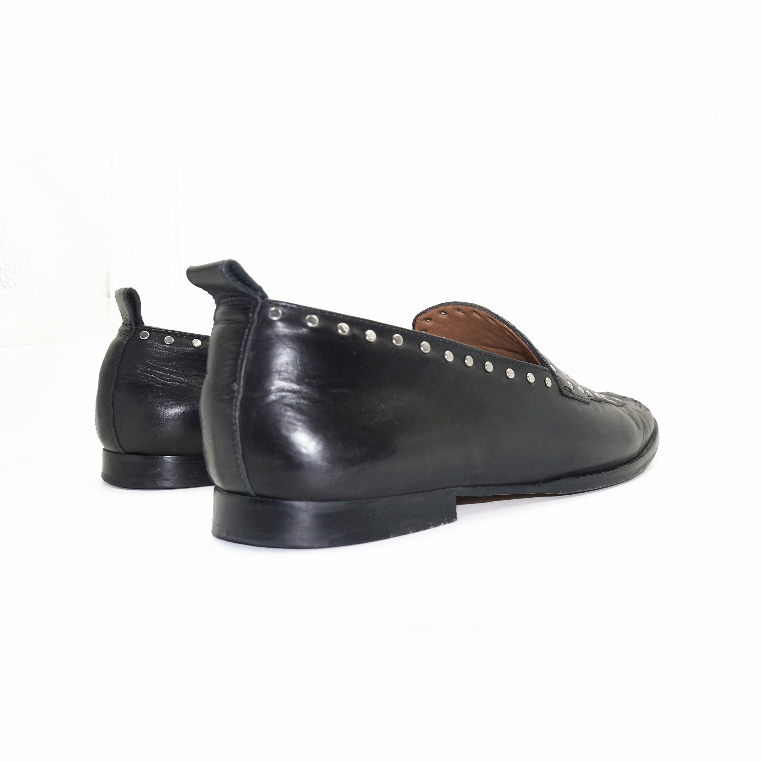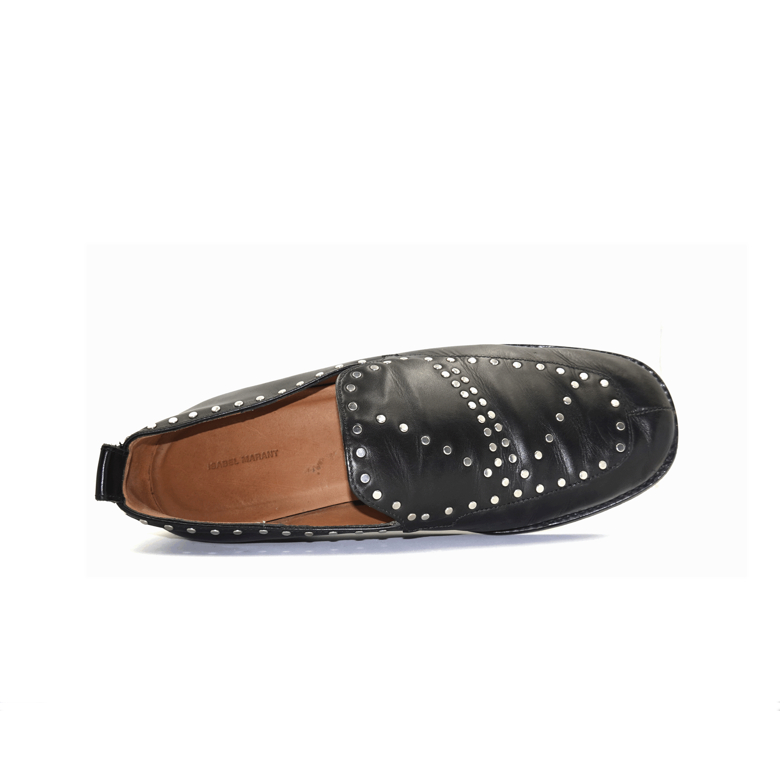 Zwarte kalfslederen loafers van Isabel Marant met zilverkleurige studs, een pull tab bij de hak, hoekige teen en platte zool. Dit zijn de loafers die je op dit moment wil dragen met sportsokken onder een wijde short, of als eenvoudige manier om je outfit pit te geven. De padded zool van kalfsleer zorgt voor dagenlang comfort, moeiteloos.